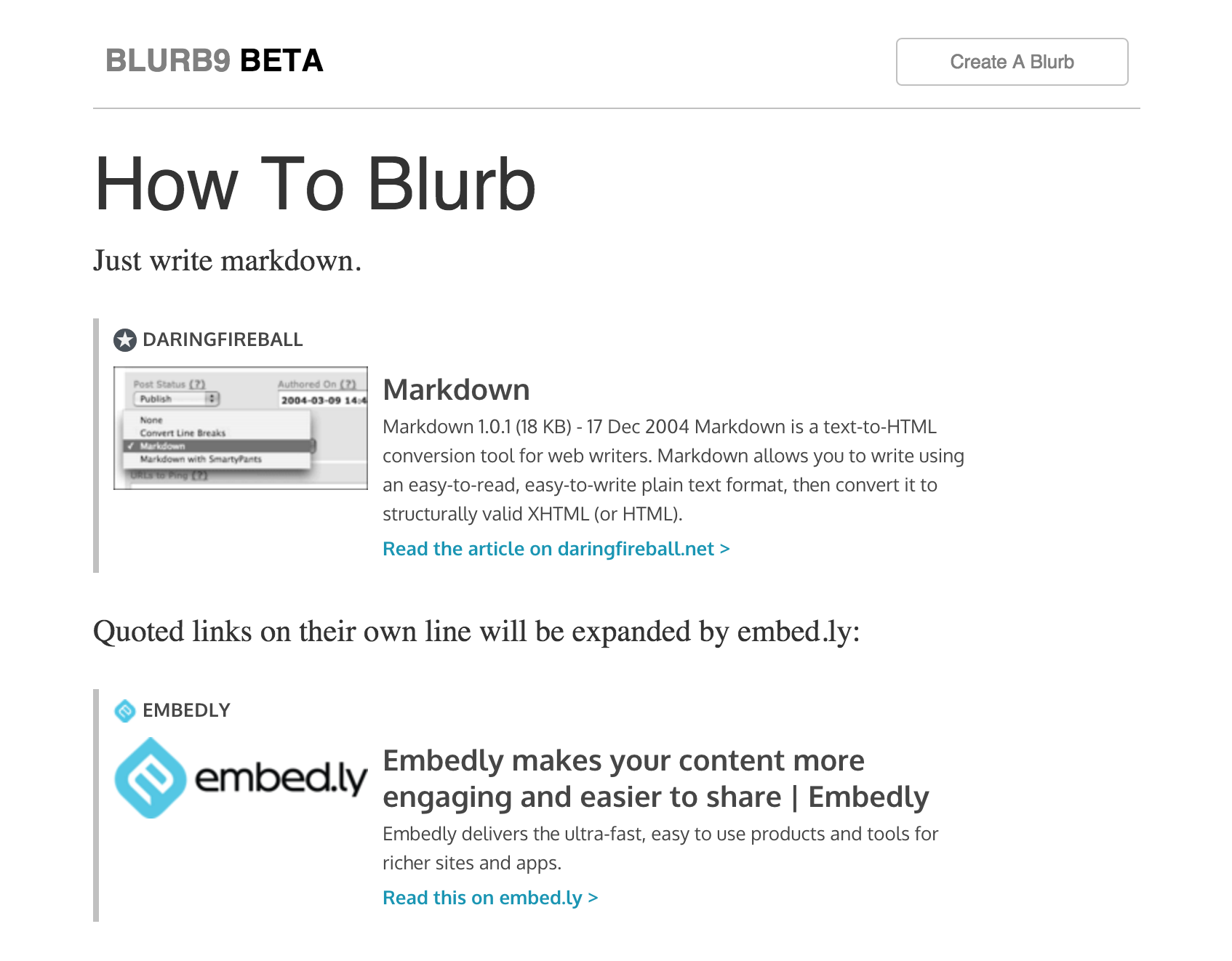 Blurb9—a mashup of Markdown, Embed.ly, and the anonymous app pattern, powered by Panda Strike open source.